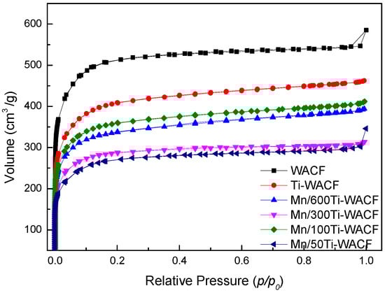 The adsorption/desorption isotherms of WACF and Mn/TiO2–WACF with different Mn doping concentrations are shown in Figure 4. The figure shows that all samples belong to the typical I-type adsorption isotherm (Langmuir isotherm), and the pore structure is dominated by micropores. The curves of WACF and Mn/50Ti–WACF experienced obvious hangover boosting phenomena, and they belonged to I-B type material; the other materials belonged to I-A type material. The N2 adsorption capacity of unloaded WACF sample was higher than that of Mn/TiO2–WACF sample. The hysteresis of the former adsorption and desorption processes was more obvious than the latter, indicating that the former had larger mesopores and macropores than the latter. This finding indicates that the photocatalyst was successfully loaded onto the fiber surface or filled with the pores of the load material. Meanwhile, N2 adsorption quantity of Mn-doped material was lower than that of the undoped material, indicating that the load rate of TiO2 became higher after Mn doping.