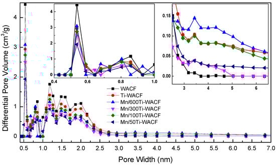Pore size distribution (density functional theory method) of WACF and Mn/TiO2–WACF.