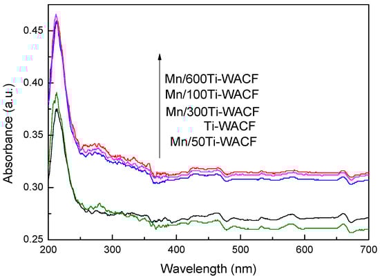 The UV–Vis spectral absorption curve of loaded materials with different Mn doping concentrations is shown in Figure 6. In the visible light region, the absorption difference of TiO2 material was not significant with different Mn:Ti molar ratios, i.e., 1:600, 1:300, and 1:100; these results are mainly due to the fact that the actual amount of Mn ions added was similar yet had greatly increased in comparison with pure TiO2-loaded materials (the maximum improvement was Mn/600Ti–WACF material). This finding indicated that Mn doping can change the light absorption properties of TiO2, and also showed that the effect of Mn doping was not affected by the loading process and the carrier fibers [28]. The visible light absorbance of Mn and Ti molar ratio of 1:50 was slightly lower than that of pure TiO2, while the Mn doping amount was excessive and some of the impurity levels provided the chance of electron–hole pairing in the photocatalytic reaction.