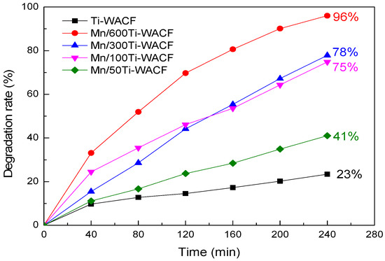 The visible light degradation curves of MB solution with varying illumination time are shown in Figure 7. The Figure 7 shows that the degradation rate of the loading material increased with the prolongation of the illumination time, and the degradation effect of the Mn-doped sample was better than that of pure TiO2. The degradation of Mn/600Ti–WACF samples was the most satisfactory, which was up to 96%, and 73% higher than that of TiO2. With the increase of Mn doping concentration, the adsorption effect of the initial stage was enhanced, and the photocatalytic effect at later stage is enhanced; thus, Mn doping can improve the adsorption performance of the TiO2-loaded material in the liquid environment and the concentration of target contaminants around the photocatalytic material, providing favorable conditions for subsequent photodegradation ranges.