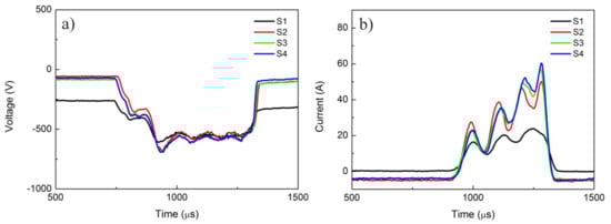 Cathode (a) voltage and (b) current waveforms for different samples.