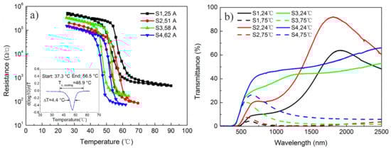 Other studies have proved that the grain size affects the phase transition temperature of the polycrystalline VO2 thin film, and the film with a small gain size possessed a low MIT temperature [23,26,44]. As a result, the high MIT temperature of sample S1 could be attributed to its large grain size. However, since the grain sizes of samples S2, S3, or S4 were similar, the influence of the grain size on the phase transition temperature of these samples could be neglected. Similarly, the impact of the thickness could be ignored as well because these films possessed similar thicknesses.