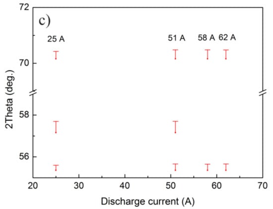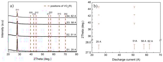 According to previous studies, the MIT temperature of VO2 thin film can be affected by a lattice distortion, and the transition temperature decreases with the difference between the interplanar spacing of the as-deposited thin film and standard rutile VO2 [29,33,40]. To compare the lattice distortions before and after the phase transition process, the respective diffraction angles of standard VO2(R) (JCPDS 44-0253) were marked with red dashed lines. Since the magnitudes of the 2θ deviations are not clear in Figure 3a, magnified 2θ differences between the experimental diffraction angle of the as-deposited film and that of the standard VO2(R) are shown in Figure 3b,c. It can be found that the 2θ deviations were basically the same when the discharge current was changed, which means that the lattice distortions in all of the as-deposited films were similar. Therefore, the influence of the lattice distortion on the phase transition temperature of these films is neglected in this work.