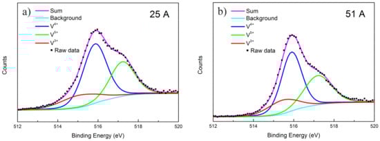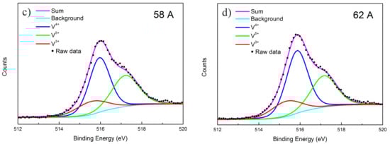 The XPS V(2p) spectra recorded on the as-deposited VO2 film are exhibited in Figure 4a–d. All of the peaks were resolved into three main components at 516.9–517.2, 515.7–516.2, and 515.2–515.7 eV, corresponding to V5+, V4+ and V3+, respectively [41]. In addition, the relative concentration of V3+, V4+ and V5+ in the as-deposited VO2 thin films were calculated and are listed in Table 3. It is clear that VO2 was the main content for all the films, and the contents of V5+, V4+ and V3+ were similar. According to previous studies [41,42,43], V5+ could be attributed to the surface oxidization during storage in air, and the occurrence of V3+ was to keep the charge neutrality in the VO2 thin film.