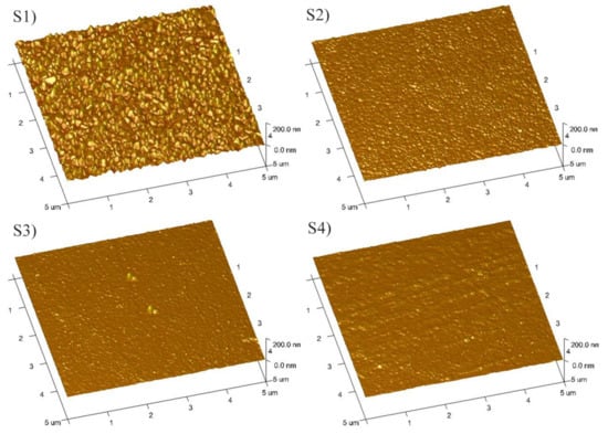 Figure 5 displays the SEM images of the as-deposited VO2 thin films. It is clear that all the films possessed a nano-crystalline structure. In addition, the grain size varied with the discharge current. It can be found that sample S1 had the largest grain size, and other samples possessed similar small grains. As we know, the greater the peak current, the higher the ion density, and a high density ion impingement will retard the growth of the grains. Therefore, a large discharge current benefits the reduction of the crystalline size. However, when the discharge current was greater than 51 A (samples S2, S3, and S4), the crystalline size did not decrease any longer. The AFM images of the as-deposited VO2 thin films are shown in Figure 6. The roughness of samples S1, S2, S3, and S4 was 7.39, 2.14, 1.45, and 1.76 nm, respectively, which coincided with the SEM results.