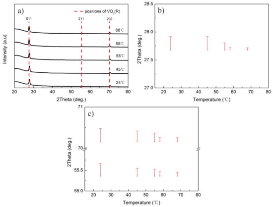 To explain the reason that the MIT temperature of sample S2 was higher than those of samples S3 and S4, the structural changes in phase transition processes of samples S4 and S2 were compared. Figure 7a shows the XRD patterns of sample S4 during the heating process. The red dashed lines marked the diffraction peaks of standard VO2(R). Figure 7b,c give the magnifications of the deviations in 2θ from the peaks of standard VO2(R). It is clear that the interplanar spacing of (011), (211) and (202) planes of sample S4 was shifted step by step towards those of the standard VO2(R) in the heating process, implying that the crystal structure of polycrystalline VO2(M) thin film gradually became more similar to that of VO2(R). However, the change in the diffraction angle of the (011) plane was very small when the temperature was increased from 24 to 45 °C, which hints that the crystalline structure of the as-deposited film kept its original configuration in this temperature region. When the temperature was elevated from 45 to 58 °C, an obvious change in 2θ took place. When the temperature was increased from 58 to 68 °C, the reduction of the diffraction angle was very slight. Meanwhile, the diffraction peaks of the as-deposited VO2 thin film at 68 °C basically coincided with those of standard VO2(R), which reveals that the phase transition was completed. In addition, from the temperature dependences of the electrical resistance for sample S4, we can also find that the resistance changed rapidly from 45 to 58 °C, which should be derived from the obvious structural change in this region.