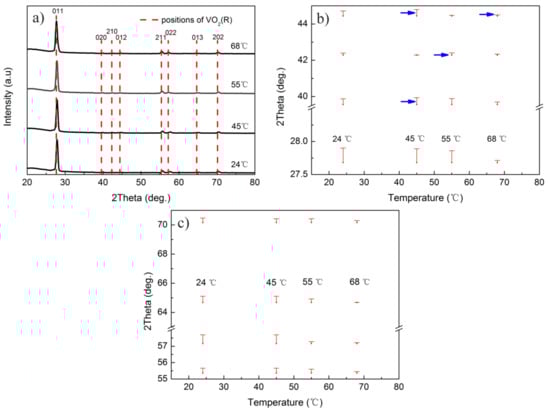 (a) XRD patterns of sample S2 during the heating processes; and (b,c) magnified 2θ differences between the experimental diffraction angles and those of the standard VO2(R) at different temperatures. Therein, the diffraction angles indicated by the blue arrows increased instead of decreasing during heating process.