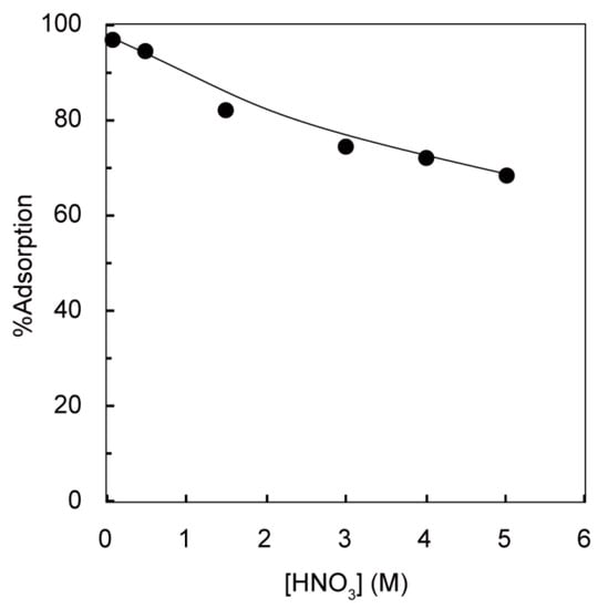 Effect of HNO3 concentration on the recovery of Ag(I) using the PEI-microalgae. Conditions: Ag(I) concentration = 0.2 mM, weight of adsorbent = 10 mg, volume of test solution = 10 mL, temperature = 30 °C, and shaking time = 24 h.