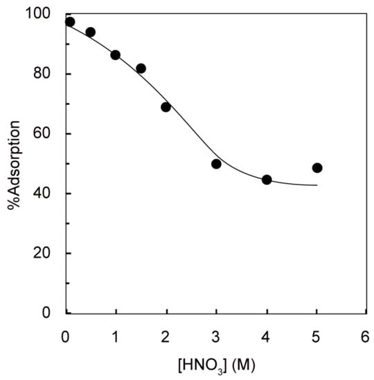 Figure 1 and Figure 2 show the effect of the nitric acid concentration on the adsorption percentage of Ag(I) from varying concentrations of nitric acid solution on PEI-MAR and DTO-MAR gels, respectively. As seen from these figures, the adsorption of Ag(I) decreases with increasing nitric acid concentration in both cases, which may be attributed to the formation of a nitrate complex of Ag(I) in the aqueous solution, as shown in Equation (3), that is difficult to be adsorbed when interacting with the functional groups on the gels.