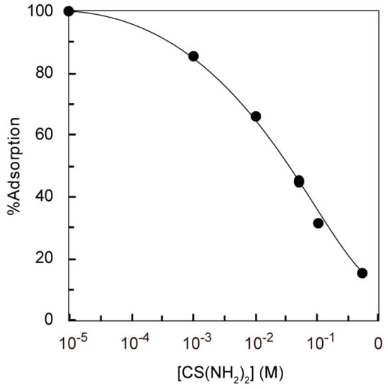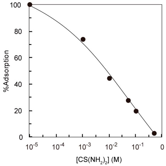 Effect of thiourea concentration on the adsorption of Ag(I) on the PEI-MAR. Conditions: Ag(I) concentration = 0.2 mM, weight of adsorbent = 10 mg, H2SO4 concentration = 0.05 M, volume of test solution = 10 mL, temperature = 30 °C, and shaking time = 24 h.