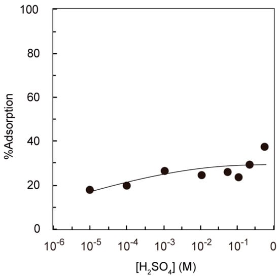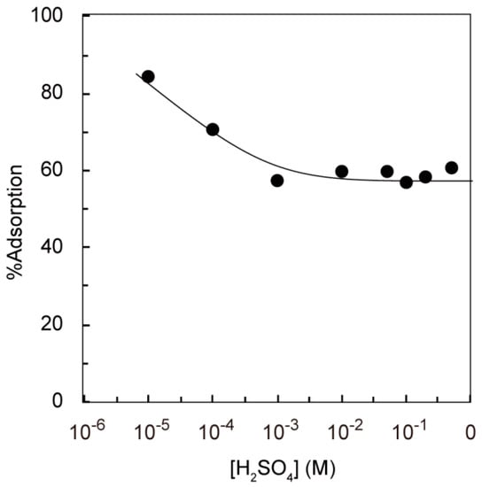 The adsorption of silver on PEI-MAR gelincreases slightly with an increasing sulfuric acid concentration in the low concentration range (<10−3 M) of sulfuric acid, while it becomes nearly constant in the higher concentration range (>10−3 M). On the other hand, for the adsorption on DTO-MAR gel, the adsorption decreases with an increasing concentration of sulfuric acid in the low concentration region (<10−3 M), but also becomes nearly constant in the higher concentration range (>10−3 M). That is, contrary to the effect of the thiourea concentration shown in Figure 3 and Figure 4, the concentration of sulfuric acid oppositely affects the adsorption of silver(I) in these two adsorption systems, which may be qualitatively interpreted by taking into account the protonation of thioamide groups of thiourea and DTO-MAR gel, as mentioned below.