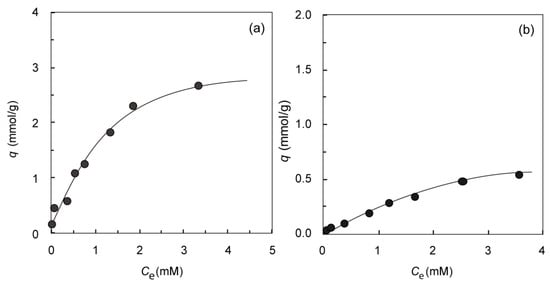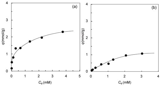 where Ci and Ce (mM) denote the initial and equilibrium concentrations of Ag(I), while q (mmol·g−1), M (g) and V (dm3) denote the amount of adsorbed Ag(I) on the gels, the dry weight of the gels added and the volume of the test solutions, respectively.