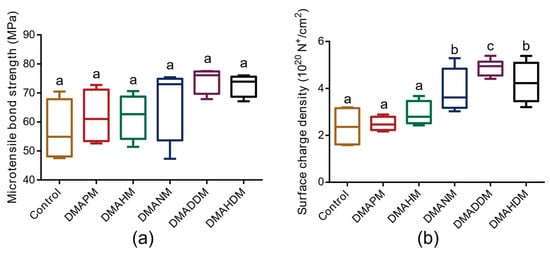 The physical properties of cured adhesives. (a) The micro-tensile bond strength (n = 4); and (b) the surface charge density (n = 12) of adhesives. Bars with the same letter indicate a value having no significant distance, and those with different letters indicate a significant difference (p < 0.05).