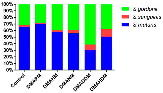 The microbial composition of three-species biofilms on adhesive disks cultured for 24 h was tested using the real-time polymerase chain reaction (real-time PCR). Figure 3 displays the ratio variation of three bacteria in multi-species biofilms. Among the control group, the DMAPM and the DMAHM group, there was an increasing proportion of S. mutans in biofilms, and the percentage reached around 70%. Thus, the proportion of S. sanguinis and S. gordonii decreased. However, in the DMADDM group and the DMAHDM group, the ratio of S. mutans steadily decreased to 30% and 50%, respectively, and the ratio of S. sanguinis also decreased. As for S. gordonii, the ratio reached up to 8% and 11% in the DMADDM group and the DMAHDM group, respectively.