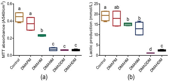 The lactic acid production of the biofilms on adhesive disks is plotted in Figure 4b. The lactic acid production of the DMAHM, DMADNM, DMADDM, and DMAHDM groups was significantly lower than that of the control group (p < 0.05). In particular, the biofilms on the adhesive disks containing DMADDM produced the least lactic acid. The DMAPM group was not significantly distinct from the control group in lactic acid production (p > 0.05).