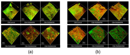 The result of the live/dead bacteria staining is exhibited in Figure 6a. Biofilms on the adhesive disks containing DMAPM and no QAMs became denser than the biofilms on other adhesive disks. In contrast, the biofilms of the DMADDM and the DMAHDM group were hardly recognizable, indicating that these biofilms did not fully develop. Figure 6b shows the result of exopolysaccharide (EPS) staining. Red represents EPS staining, which can protect pathogenic bacteria and contribute to their pathogenicity. Here, too, the EPS staining of biofilms on the adhesives containing DMADDM and DMAHDM was hardly recognizable.