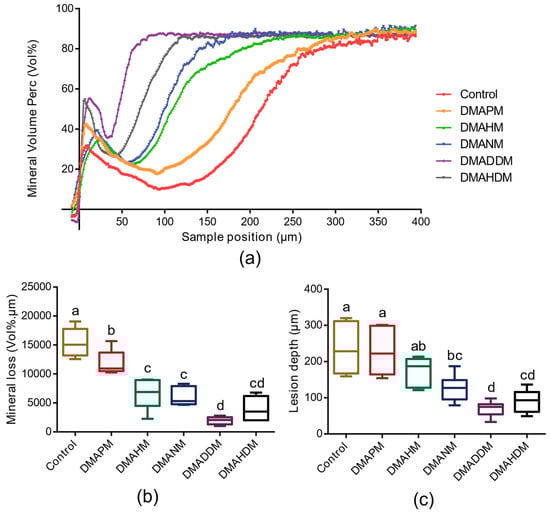 Figure 7a shows the mineral volume content of the enamel bonding with composites by QAM adhesives. Figure 7b,c show the mineral loss and lesion depth of the enamel bonding with composites by adhesives, respectively. Compared with that of the control group, the mineral loss of the groups containing QAMs decreased significantly (p < 0.05). The lesion depth of the DMADNM, DMADDM, and DMAHDM groups was significantly lower than that of the control group (p < 0.05). In particular, in both mineral loss and lesion depth, the DMADDM group was the lowest.