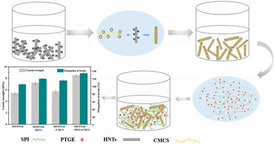| Sample | SPI (g) | Glycerol (g) | Water (g) | PTGE (g) | HNTs (g) | CMCS (g) |