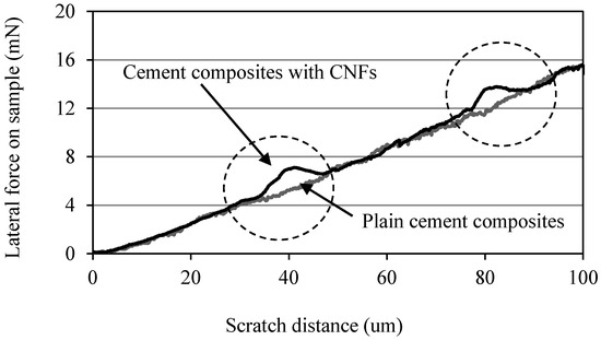 The lateral force required by the indenter to displace the material as a function of the scratch length is shown in Figure 6. It can be seen that, for both OPC and OPC/CNF composites, the lateral force steadily increased from 0 to 15.5 mN in order to displace a scratch length of 100 μm. This contradicts the findings obtained by Lahiri et al. [22], in which it was observed that the lateral force required to displace the material increases in the presence of CNTs. However, in this study, there was a slight variation in the force required to dislocate the material with minor jumps in the lateral force (denoted by circles in Figure 6). These small jumps could be due to the presence of CNFs in the cement matrices.