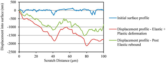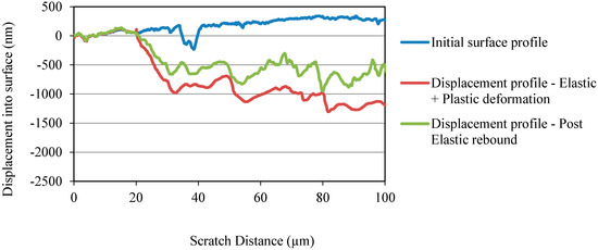 Three different scratch profiles corresponding to initial surface profile, displacement profile due to elastic and plastic deformations, and displacement profile due to post elastic rebound are shown in Figure 7 and Figure 8 for OPC and OPC/CNF composites, respectively. From the scratch profiles, it is evident that the indenter penetrated more into the OPC surface compared to OPC/CNF composites. The deepest penetration in OPC/CNF composites was observed to be less than 1275 nm, as opposed to over 2000 nm for OPC. The penetration depth is a mechanical response of the material, which means that a shallow penetration is induced by harder materials. As expected, CNFs as rigid fillers into OPC make their composites harder to go through by the indenter.