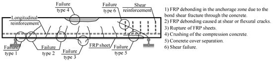 Fiber-reinforced polymer (FRP) has been recognized as a construction material with wide applications. Apart from being manufactured in the form of bars for use as embedded reinforcements, FRP can be produced in the form of sheets externally bonded to reinforced concrete (RC) structures for the purposes of strengthening and repair [1,2]. Although some types of FRP (e.g., glass or basalt fiber-reinforced polymers) possess relatively low deformation modulus, when used as an additional externally bonded component (sheet, plate, laminate, etc.) to the RC element, the resulting composite can be effective in controlling the development of cracks [3]. The externally bonded component introduces additional failure modes to the composite structural element that should be duly considered in the design, such as brittle loss of the bond at the FRP-concrete interface [4,5,6,7,8], and rip-off of the concrete [9]. Figure 1 illustrates the different failure modes, which are characteristic of the externally bonded flexural RC members.