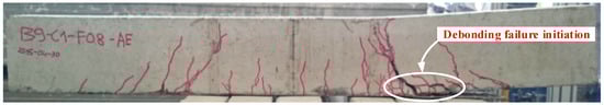 It should, however, be noted that the actual layout of the steel pins to avoid unacceptable stress concentrations and local failure of the concrete needs to be tested with the presence of the concrete member. Besides, the bond strength between the CFRP and concrete needs to be tested with concrete members jointed with the CFRP sheets. Steel pins of 1.4 mm in diameter and 15 mm in length were fabricated, as depicted in Figure 3. Holes of 1.45 mm diameter were drilled through the carbon fiber laminates of the coupon specimens at 18 mm from the boundary edge. Designated numbers of pins from two up to six were tested. It was found that the bearing resistance of the CFRP sheets and the shear resistance of the steel pins were sufficient. In a separate study [22,23], different layouts of the pins were applied to the fastening of CFRP sheets to concrete beams. Holes of 3 mm diameter were drilled through the CFRP sheets into the concrete to enable installation of the steel pins. It was found that the use of 2 × 4 pins resulted in sudden debonding of the CFRP sheets from the beam (Figure 4), with the initiation of crack at the boundary of the pure bending zone (Figure 5). Alternatively, the use of 2 × 6 pins with the longitudinal spacing of the steel pins was taken as the experimental distance between cracks, equal to 100 mm (Figure 6), resulted in an increase of the maximum load and deformation at failure by approximately 8% and 20%, respectively. Hence, the use of a 2 × 6 array of pins was rather effective. Nevertheless, the length of the pins was found to be insufficient in suppressing the failure of the bond as the pins were forced out from the concrete. Therefore, a set of pins of 25 mm in length was fabricated for the composite beam tests.