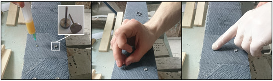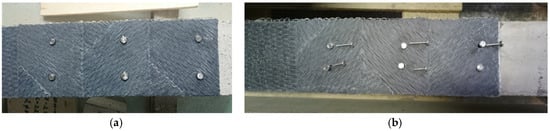 Hybrid jointing using 2 × 6 pins: (a) installed pins; (b) pins of 15 mm and 25 mm lengths.