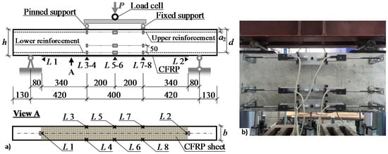 Linear variable displacement transducers (LVDT) (L 3 to L 8 in Figure 7) were used to measure the vertical displacements in the pure bending zone. Slip of the CFRP sheets with respect to the concrete surface was measured using LVDT (L 1 and L 2 in Figure 7). To assess the average curvature in the pure bending zone, three continuous LVDT lines were located at different heights as shown in Figure 7. The upper and lower LVDT lines were placed along the top and bottom reinforcement, whereas the middle line was located 50 mm offset from the bottom one. A load cell was used to measure the applied load. All measured data from the LVDT and the load cell were collected and recorded by an Almemo 2890-9 data logger. The crack development was monitored using a high-speed camera and digital image correlation (DIC) system (Figure 9) with the aid of DaVis 8.1.6 software by La vision.
