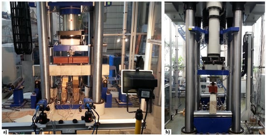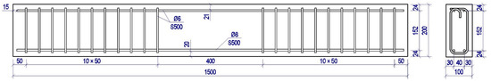 The experimental program encompassed 10 composite beams. All beams had a uniform cross section of 100 mm width and 200 mm depth, nominal length of 1500 mm, and span length of 1240 mm. The beams were simply supported and subjected to four-point bending with shear spans of 420 mm at both sides (Figure 7). The reinforcement detailing of the beams is illustrated in Figure 8. The tension reinforcement was 2 mm × 8 mm diameter steel bars, and the compression reinforcement was 2 mm × 6 mm diameter steel bars. To avoid shear failure, the 6 mm diameter steel stirrups were spaced at 50 mm along the shear spans. The specimens were loaded using a 5000 kN hydraulic actuator in a stiff testing frame (Figure 9). The loading rate was 0.2 mm/min.