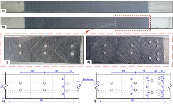 CFRP sheets: (a) distribution of the sheets without fastening; (b) with additional lay-up for hybrid jointing; (c) layout of the pins of beam I(II)-B4-C-A12; (d) layout of the pins of beam I(II)-B5-C-A20; (e) dimensions of 2 × 6 pins; (f) dimensions of 2 × 10 pins.