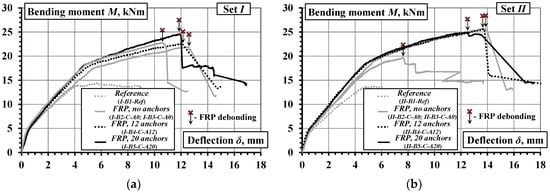 Figure 12 shows the bending moment versus mid-span deflection diagrams of the beams. The reference beams exhibit considerably lower load-carrying capacity and smaller yielding and ultimate deflections than the remaining beams. For the specimens bonded with the CFRP sheet without additional fastenings, the deformation behavior and ultimate capacity among the beams I-B2-C-A0 and I-B3-C-A0 (Figure 12a), and II-B2-C-A0 and II-B3-C-A0 (Figure 12b) established considerable variations. For the specimens with the adoption of hybrid jointing, i.e., beams I-B4-C-A12 and I-B5-C-A20 (Figure 12a) and II-B4-C-A12 and II-B5-C-A20 (Figure 12b), the load-carrying capacity was marginally higher and the ultimate deflection was substantially larger.