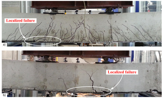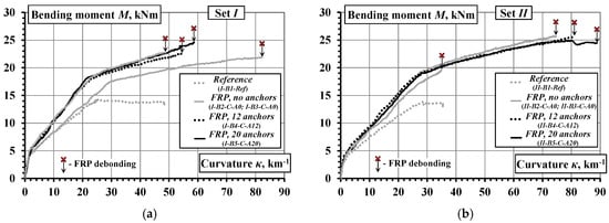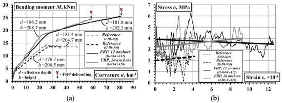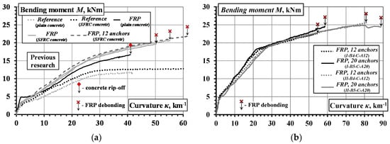 The structural integrity is understood as a property to resist the applied loading without failure or loss of the connection between the composite components. This is a general issue in the design of composite structural elements [36]. The present study is focused on the composite action of the external CFRP sheets and concrete in the tension zone of the beams. The current results are to be considered in the context of the previous findings [21,22,23]. The structural integrity could be related to the ability of steel fibers to alter the failure character, resulting in an increase of the load-carrying capacity of the beams with external CFRP sheets. Figure 18a presents the moment-curvature diagrams of the beams from previous research [23]. The following three important observations could be made: