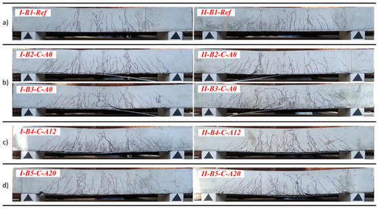 Monitoring results of the slip of the CFRP sheets by way of LVDT L 1 and L 2 are summarized in Table 3. As can be observed, the beams without hybrid jointing (I-B2-C-A0, I-B3-C-A0, and II-B2-C-A0) exhibited lower values of bending moment at the initiation of slip (the test recording for the beam II-B3-C-A0 was lost due to failure of the LVDT connections). The beams with hybrid jointing (I-B5-C-A20, II-B4-C-A12, and II-B5-C-A20) exhibited the highest values of maximum slip, though contrasting results were observed for the beams II-B2-C-A0 and I-B4-C-A12. Splitting of the CFRP sheet was observed in the beam II-B2-C-A0, and was the consequence of the high maximum slip obtained. The observed relatively small value of the maximum slip of the beam I-B4-C-A12 can be related to the localized debonding near the flexural cracks (Figure 20a), while the pins assured the mechanical contact in the anchorage zone. For all the CFRP bonded beams in group I and group II, there was an increase in the load-carrying capacity ranging from 51.9% to 70.8% and from 42.4% to 86.0% compared to the reference beams I-B1-Ref and II-B1-Ref, respectively.