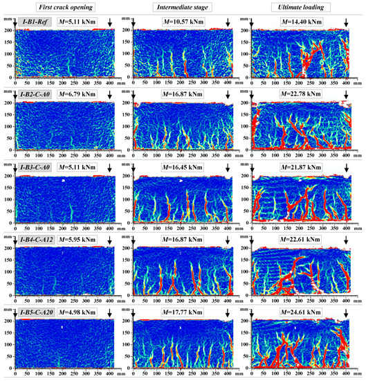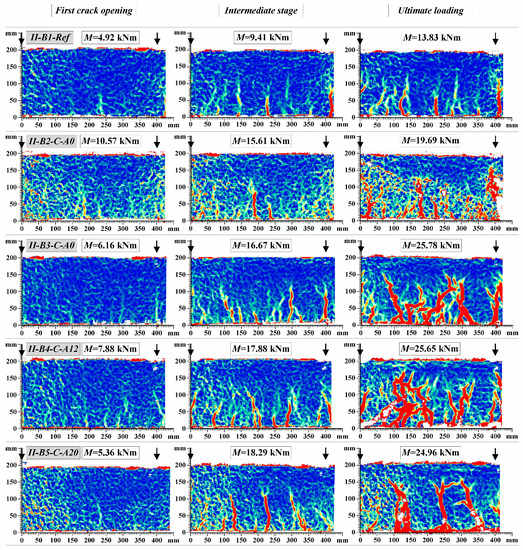 Figure 14 shows the final crack pattern of the beams. The multiple cracks smeared-out in the tensile zone indicated the efficiency of the composite members: the external sheet transferred the tensile stresses through the crack planes and suppressed the localization of the discrete cracks. In comparison with the unbonded counterparts, the externally bonded beams were characterized by the smeared crack pattern through the bonded zone; and the major cracks were formed only at relatively high levels of load approaching the yielding of the steel reinforcement. As can be observed in Figure 14b, the peeling-off failure is typical for the externally bonded beams with pure adhesive bonding of CFRP sheets, while the hybrid jointing assured connection of the external sheet at the ultimate loading stages (Figure 14c,d). Further elaboration of the load resisting mechanisms will be presented in Section 4.4. Figure 15 and Figure 16 show the development of cracks in the pure bending zone monitored with the DIC system for group I and group II composite beams, respectively. The images were mirrored backside views of the crack patterns shown in Figure 14. The development of cracks at the first crack opening, intermediate stage, and ultimate loading are depicted.