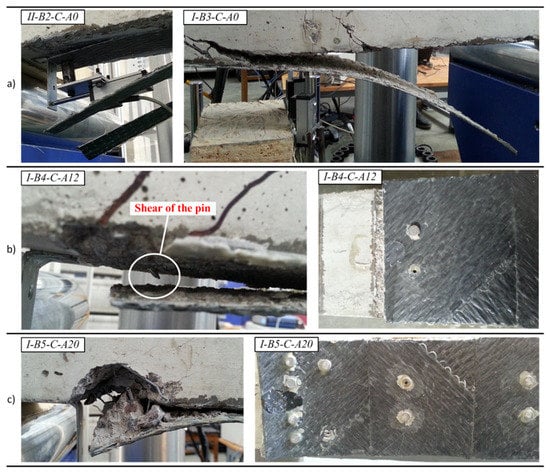 The failure character of the beams with external CFRP sheets is illustrated in Figure 19. In coherence with the previous results [23], the failure of the beams with pure adhesive bonding of carbon fiber sheets was brittle as a consequence of sudden debonding of the CFRP sheets (Figure 19a). Furthermore, a local split of the sheet was observed in the beam II-B2-C-A0 which was the consequence of different strength of the adhesive observed after the test within the damaged bond area. The layouts of pins tested provided two distinct outcomes. As shown in Figure 19b, the arrangement of 2 × 6 pins led to shear failure of the steel pins; whereas by increasing the number and concentration of pins in the boundary zone (Figure 10), the arrangement of 2 × 10 pins caused local failure of the concrete (Figure 19c), though the failure remained ductile as the remaining pins distributed outside the localized failure zone were still capable of resisting slip of the CFRP sheet.