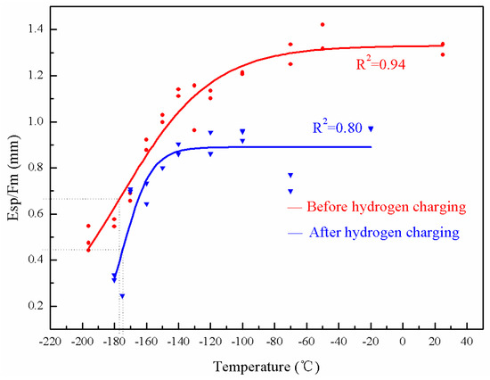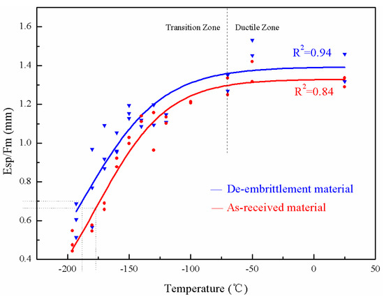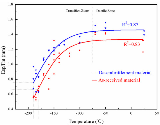 There is an offset between the as-received and the de-embrittled material curves for both the base and the weld metals, as shown in Figure 4 and Figure 5. Compared with the as-received material test results, the de-embrittlement curve shifts to the upper-left, indicating that the transition temperature moves towards lower values. Moreover, the average value of Esp/Fm of the de-embrittled samples at each temperature is higher than that of the as-received specimen.