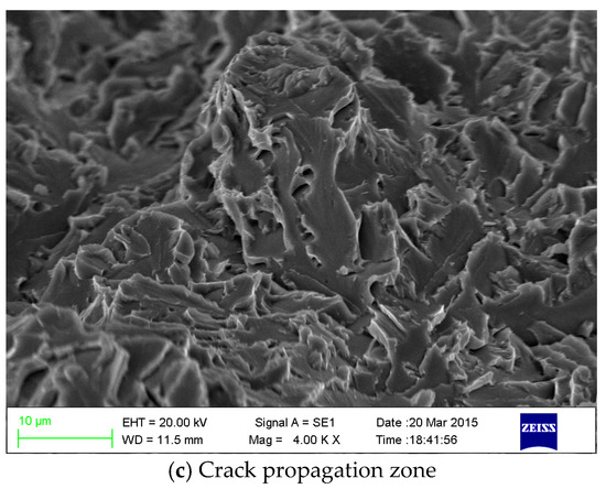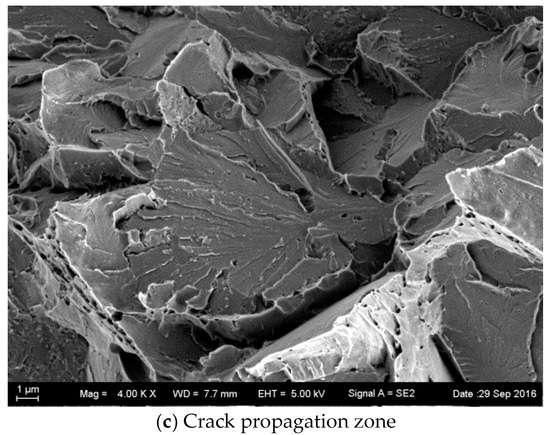 For an arbitrary but constant dissolved hydrogen content, the fracture mode changes, and there is the intergranular (IG) mode, quasi-cleavage (QC) mode, and microvoid coalescence (MVC) mode with a progressive increase in the stress intensity factor [26]. Cleavage fracture with special crow’s feet is a kind of typical fracture characteristic of HE [27] and this was clearly observed in Figure 9c, however, according to the Tsp values before and after hydrogen charging, HE is not obvious.