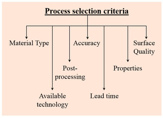 According to the focus of the manuscript (AM process selection among BJG, SLM, and EBM), we have devised some selection criteria that are to be considered in order to select the best AM manufacturing process (BJG/SLM/EBM) for fabricating a particular component with a defined set of material properties. They are: (1) the type of material to be processed; (2) the technology availability; (3) the properties and service requirement of the parts; (4) the application of the parts; (5) the post-processing requirements; (6) the surface quality of the parts; and (7) the accuracy of the parts. Several other parameters are involved that can also be considered for the selection of a suitable AM process. However, these seven criteria we considered to be the most important, hence, they are discussed in detail with examples.