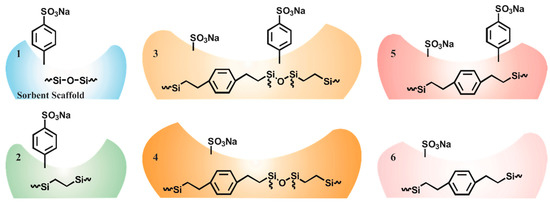 A previous study by Chen et al. utilized sulfonation of a poly-(styrene-co-divinylbenzene) resin to increase hydrogen bonding with the material and binding of glycerol by the material [23]. The study did not consider the impact of the scaffold or the morphology of the resin on target adsorption. Because the chemical structures in proximity to the sulfonate groups as well as the density of the sulfonate groups is likely to impact the interaction of those groups with glycerol, a series of porous organosilicate materials were synthesized in which the pore wall composition was varied (Table 1). In some cases, S65, S85, E25, and E50, all sulfonated sites were included through pendant phenyl groups added to the materials following surfactant extraction; no sites for sulfonation were included in the base sorbent. In other cases, ED11 and D13, diethyl benzene groups comprise a portion of the scaffold walls. Sulfonation of the materials directly (ED11a(4) and D13a,b,c(6)) or sulfonation following grafting of additional phenyl groups was then completed. The schematic provided in Figure 1 illustrates the intended variations in the resulting materials (see also Table 1).