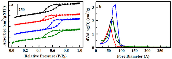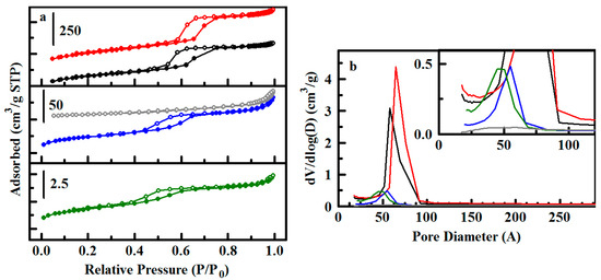 Nitrogen adsorption-desorption analysis was performed on a Micromeritics ASAP 2010 or a TriStar II Plus porosimeter at 77 K (Micromeritics Instrument Corporation, Norcross, GA, USA). Samples were degassed to 1 µm Hg at 100 °C prior to sorption analysis. Surface area was calculated by the Brunauer-Emmett-Teller (BET) method, pore size by the Barrett-Joyner-Halenda (BJH) method, and total pore volume by the single point method at relative pressure (P/P0) 0.97.
