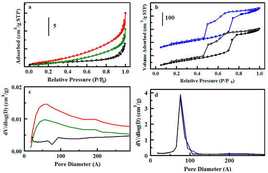 Nitrogen sorption analysis for sulfonated sorbents. (a) Nitrogen adsorption/desorption isotherms for D13-Ph1(5) (black), D13a(6) (red), and D13c(6) (green); (b) Nitrogen adsorption/desorption isotherms for D13-Ph2(5) (black) and D13b(6) (blue); (c,d) Pore size distributions for the sorbents colored as in (a,b), respectively.