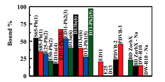 Grafting with phenyl groups followed a simple published procedure, beginning with an additional drying step at >100 °C in a vacuum [31]. Sorbent (1.0 g) was refluxed with 5 mL of phenyltriethoxysilane in 50 mL of toluene for 24 h. Grafted material was collected by gravity filtration, washed thoroughly with ethanol, and dried at 110 °C. Sulfonation was accomplished as described in the literature by magnetically stirring the phenyl-grafted material in 25 mL of H2SO4 at 75 °C for 1 d [32]. The acidic mixture was then added to ≥200 mL of H2O. Solid was collected by gravity filtration, washed with H2O, and dried at 110 °C. Sulfonated material was magnetically stirred in 50 mL of 1 M NaCl solution at RT for 1 d followed by collection by gravity filtration, washing with H2O, and drying at 110 °C. The final sulfonated, phenyl grafted materials are referred to as E25-Ph(2) and E50-Ph(2), reflecting their base E25 or E50 scaffold, the phenyl group modification (Ph), and the sorbent type (2).