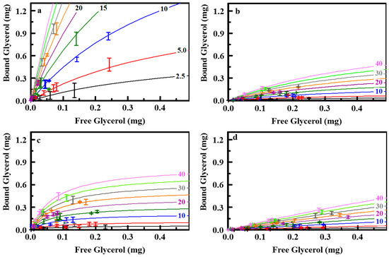 Glycerol binding data and Langmuir-Freundlich isotherms for D13b(6) (a), S85-Ph(1) (b), ED11-Ph(3) (c), and ED11 (d), sorbent with no sulfonation. Isotherms for 2.5, 5.0, 10, 15, 20, 25, 30, 35, and 40 mg presented.