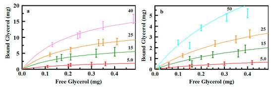 Glycerol binding data for D13-Ph2(5) (a) and D13b(6) (b) from biodiesel. Isotherms (lines) are from data sets collected in aqueous solution (Table 2).