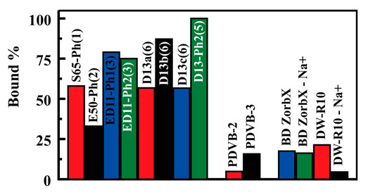 Divinylbenzene (DVB) resins were synthesized in a Teflon-lined autoclave reactor (23 mL capacity) [30]. For PDVB-2, DVB (1.5 g; Aldrich technical grade, 80%) was added to tetrahydrofuran (15 mL) with water (0.75 mL) and 2,-2′-azobis(2-methylpropionitrile) (0.0375 g; Aldrich, 98%). The reactor was heated at 100 °C for 48 h. Following cooling to room temperature, the reactor was opened and the resin was allowed to dry overnight at room temperature followed by complete drying at 100 °C. PDVB-3 was synthesized identically with the exception of the water co-porogen used in the PDVB-2 synthesis, which was omitted. Ground resin was added to hexane (20 mL) to produce a wet slurry, and sulfuric acid was added (25 mL) for the sulfonation step. The mixture was heated at 75 °C for 1 d before addition of water (300 mL). Sulfonated material was collected by vacuum filtration and washed thoroughly with water before drying at 100 °C. Sodium exchange was completed by stirring the material in 1 M NaCl (50 mL) at room temperature for 1 d. The resin was then washed with water, collected by vacuum filtration, and dried at 100 °C. Sodium exchange for commercial sorbents was completed in the same manner.