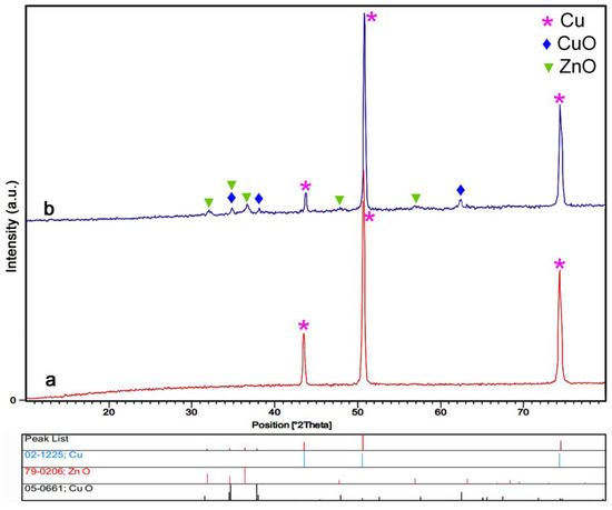 Wide-angle XRD patterns of the clean Cu foil obtained after cleaning treatment stage (a) and the as-prepared flower-like CuO-ZnO micro/nanostructures obtained after the engraving and glycothermal stages (b).