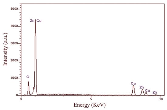For investigation of the chemical purity of the synthesized product, elemental analysis of 3D CuO-ZnO hybrid structures was performed by energy dispersive X-ray spectroscopy (EDS). The obtained EDS spectrum reveals the composition of the Cu, Zn, and O elements without any other impurity elements, as shown in Figure 3. The strong peaks of the Cu, Zn, and O elements are exhibited in the EDS spectrum. The Cu element originated from the CuO substrate and the Zn was contributed by the flower-like ZnO hierarchical structures. Furthermore, the atomic ratios of Zn to O and Cu to O are both 1:1, respectively, and this observation proves that the stoichiometric ratio is maintained.