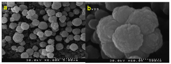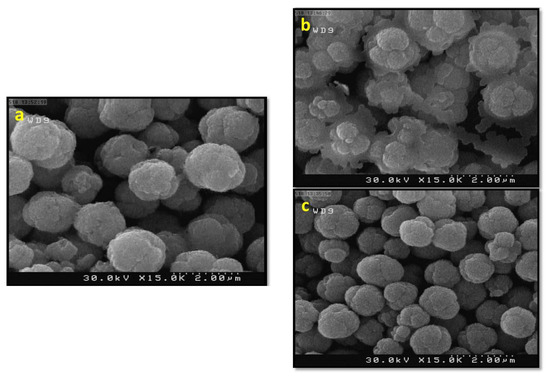 Also, the effects of the surfactants and stabilizers on the final morphology of the 3D ZnO structures were studied. A representative SEM image of the 3D CuO-ZnO hierarchical structures is shown in Figure 7. According to Figure 7a, it is clear that when PEG 6000 is used as the capping agent (Z1 sample), the particles are aggregated and bulk structures are made. The flower like structure has also been destroyed and only micro spheres are obtained. In comparison with the Z0 sample, the microspheres are denser but the mean size of the spheres is approximately the same as the flower like structures (1.491 µm).