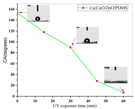 One of the most advantageous characteristics of the superhydrophobic film was its tunable wettability when it is exposed to UV irradiation. Here, in order to study the UV-enhanced wettability conversion of the CuO/ZnO/PDMS coating, the sample (surface area of 1 cm2) was placed under a UV light source (400 W mercury lamp) with a working distance of 10 cm in ambient conditions. The photodecomposition process and water contact angles as a function of the UV illumination time are shown in Figure 10. As shown, after exposing the sample to UV light for 30 min, the contact angle was decreased to about 4° and the sample nature was switched from superhydrophobic to superhydrophilic. However, when the UV-irradiated sample had been dried in a dark place at 80 °C for 24 h, the water contact angle (WCA) was increased again and the sample recovered its pristine superhydrophobic state with a contact angle of about 150°.
