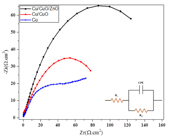 Nyquist plot for the bare Cu foil, Cu/CuO, and Cu/CuO/ZnO electrodes in 3.5% NaCl solution. The Cu/CuO/ZnO sample showed a better anticorrosion property.